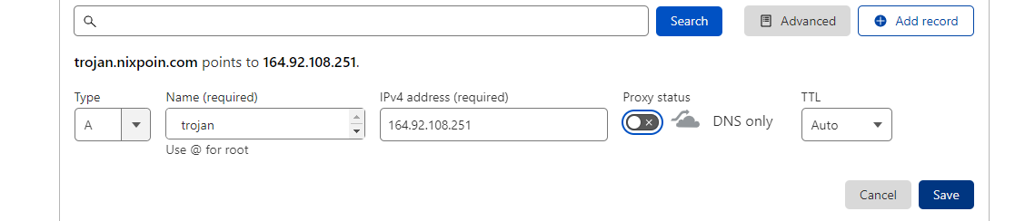 Dan sub domain yang saya gunakan nanti adalah trojan.nixpoin.com