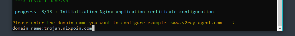 Setelah itu, kita diminta memasukkan domain yang akan kita gunakan sebagai server trojan, vmess dan vless.