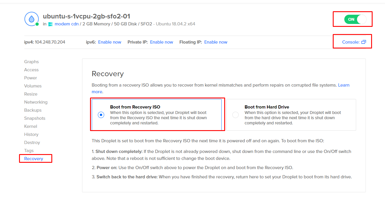 Setelah kita berhasil membuat sebuah VPS (droplet) selanjutnya kita ubah VPS kita ke mode recovery, caranya :